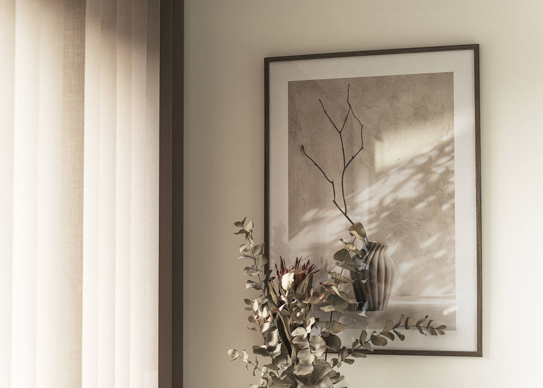 Elegant frame made from pine with walnut veneer and a real glass front (some sizes are also available with acrylic glass). Features a slim 11 mm profile and 13 mm depth, perfect for both wall and shelf display (up to size 24×30 cm). A timeless design that complements any interior.
