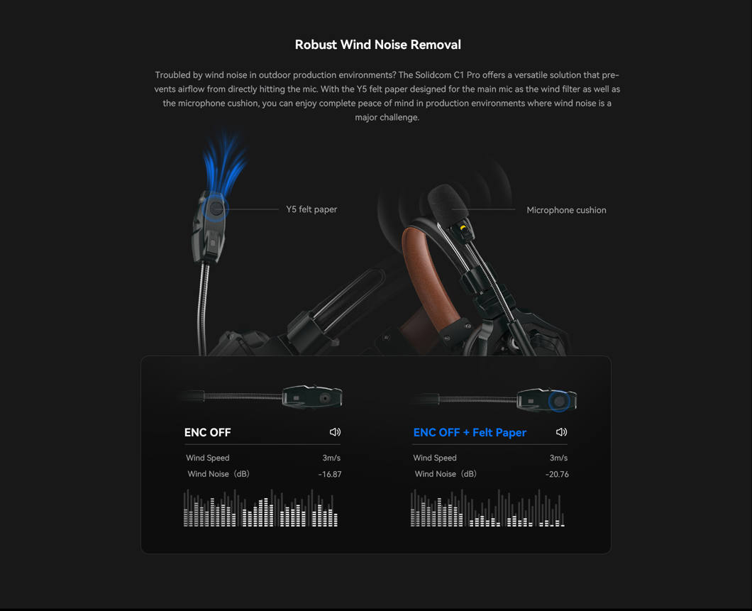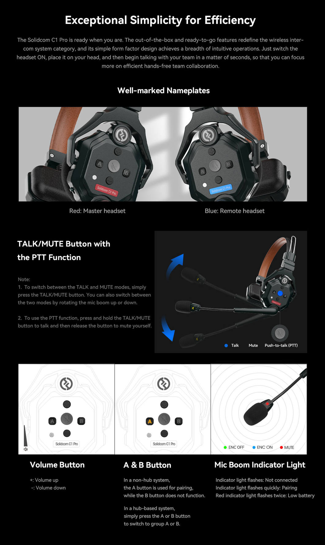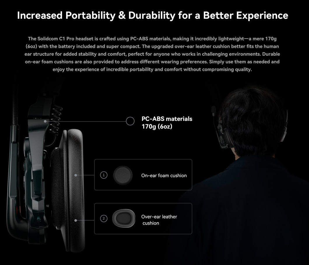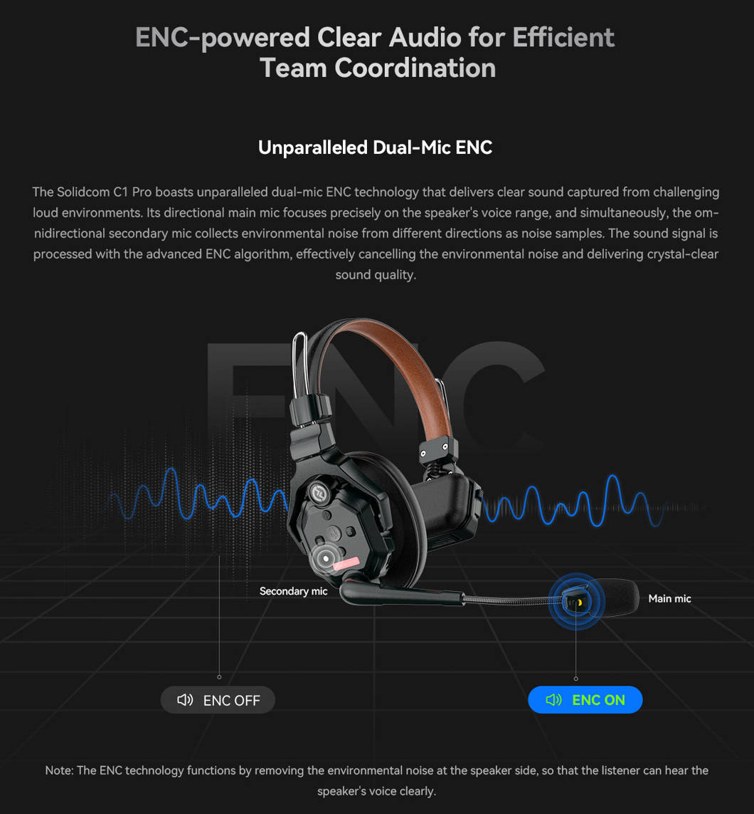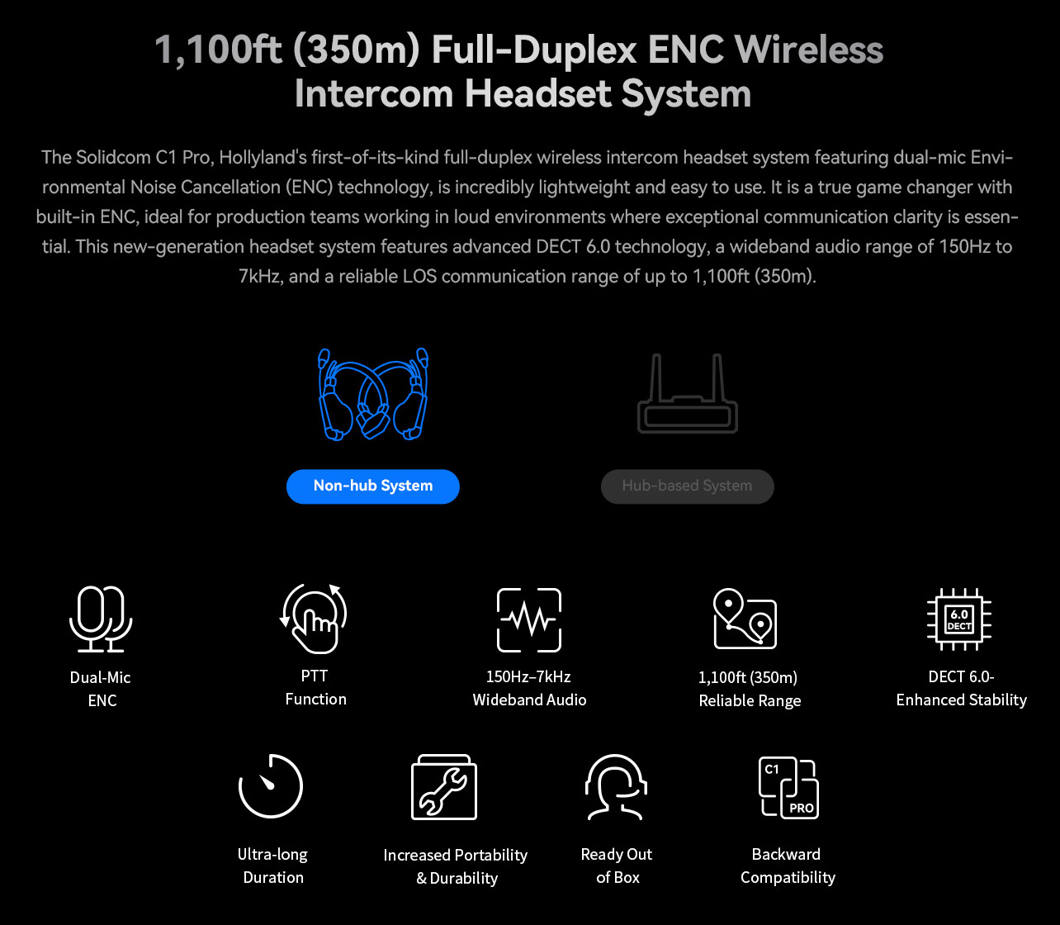 The Solidcom C1 Pro, Hollyland's first-of-its-kind full-duplex wireless intercom headset system featuring dual-mic Environmental Noise Cancellation (ENC) technology, is incredibly lightweight and easy to use. It is a true game changer with built-in ENC, ideal for production teams working in loud environments where exceptional communication clarity is essential.