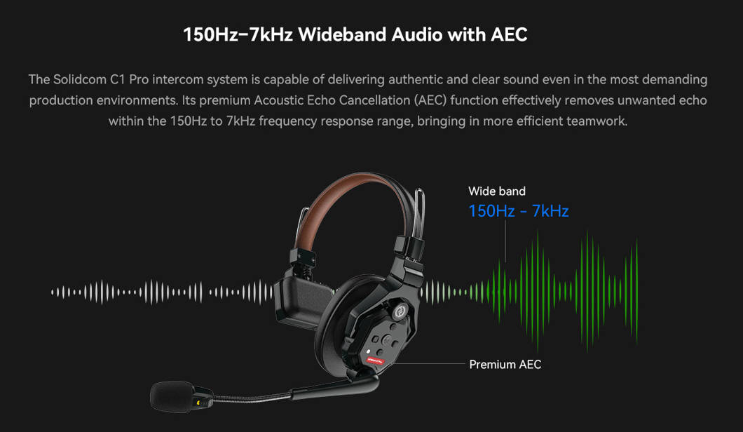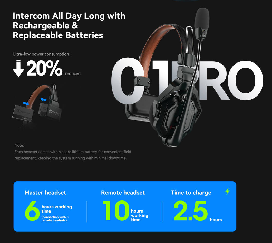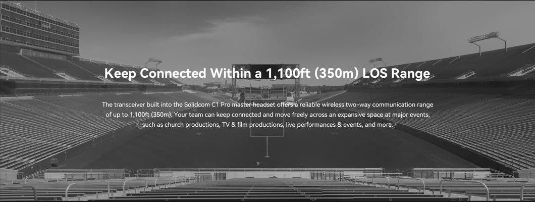 The Solidcom C1 Pro, Hollyland's first-of-its-kind full-duplex wireless intercom headset system featuring dual-mic Environmental Noise Cancellation (ENC) technology, is incredibly lightweight and easy to use, ideal for production teams working in loud environments where exceptional communication clarity is essential.